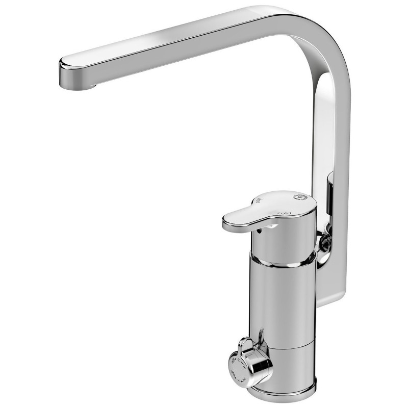 Plautuvės maišytuvas Gustavsberg Nordic 3, chromo spalvos, su ventiliu indaplovei. Plautuvės maišytuvo apdaila padeda lengvai jį prižiūrėti, todėl nereikia didelių pastangų jį valant. Maišytuvo valymui naudojamas tik vanduo ir muilas, kad jo paviršius liktų nepažeistas. Maišytuvas sukasi 110°/60° kampu, valdomas su rankenėle per vidurį, o srovė reguliuojama. Reguliuojama maksimalios temperatūros funkcija, apsauganti nuo nusideginimo ir kalkių kaupimosi. Gustavsberg Nordic 3 maišytuvo dizainas, derinasi prie įvairaus virtuvės interjero, todėl tai puikus pasirinkimas, norintiems išskirtinio plautuvės maišytuvo. Vandens pajungimas - G 3/8" (indaplovei - G 1/2"). Maišytuve naudojama keraminė kasetė užtikrina sklandų ir ilgaamžį maišytuvo veikimą. Suteikiama 5 metų garantija.