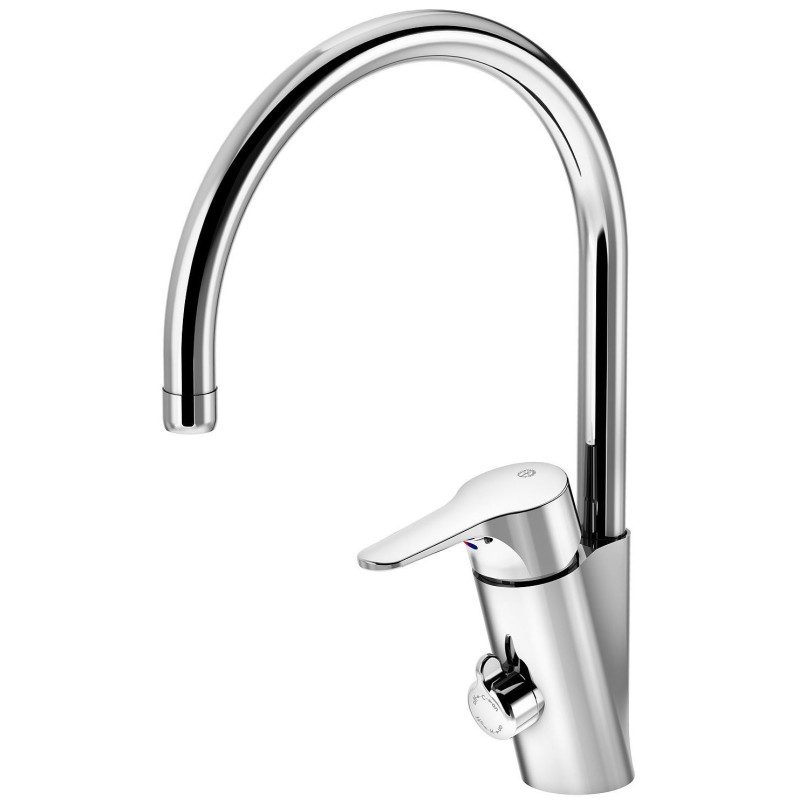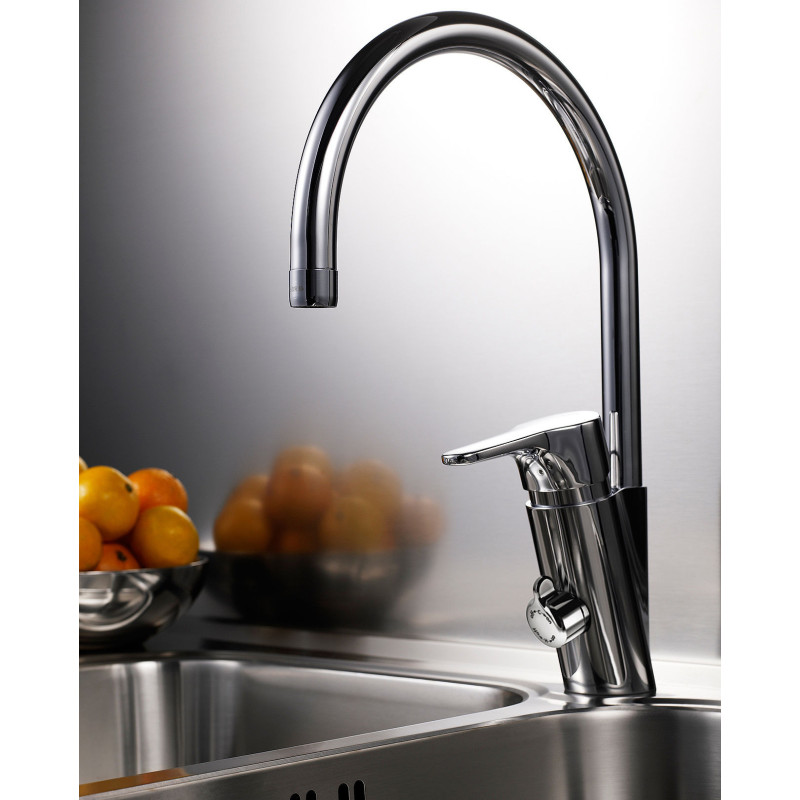 Plautuvės maišytuvas Gustavsberg Nautic, chromo spalvos, su ventiliu indaplovei, aukštu snapu. Plautuvės maišytuvo apdaila padeda lengvai jį prižiūrėti, todėl nereikia didelių pastangų jį valant. Maišytuvo valymui naudojamas tik vanduo ir muilas, kad jo paviršius liktų nepažeistas. Maišytuvas sukasi 110°/60°/0° kampu, valdomas su rankenėle per vidurį. Reguliuojama maksimalios temperatūros funkcija, apsauganti nuo nusideginimo ir kalkių kaupimosi. Gustavsberg Nautic maišytuvo dizainas, derinasi prie įvairaus virtuvės interjero, todėl tai puikus pasirinkimas, norintiems išskirtinio plautuvės maišytuvo. Vandens pajungimas - G 3/8" (indaplovei - G 1/2"). Maišytuve naudojama keraminė kasetė užtikrina sklandų ir ilgaamžį maišytuvo veikimą. Suteikiama 5 metų garantija.