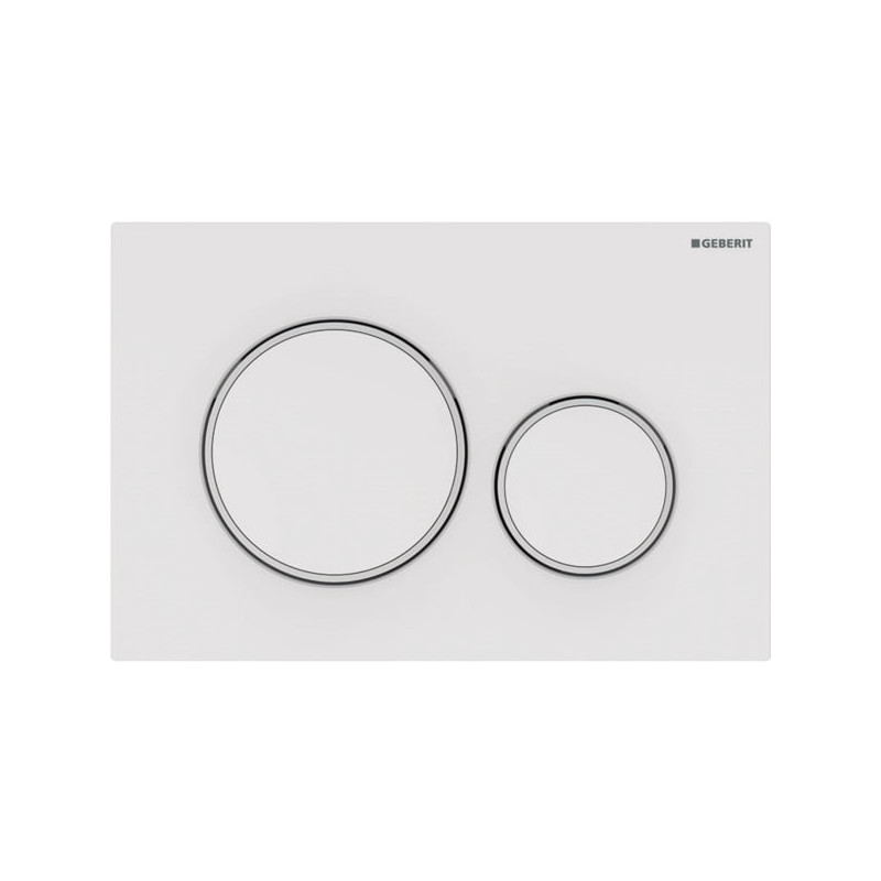 Vandens nuleidimo mygtukas Geberit Sigma20, baltas. Du mygtukai pasirinktam iš dviejų tipų vandens nuleidimui.