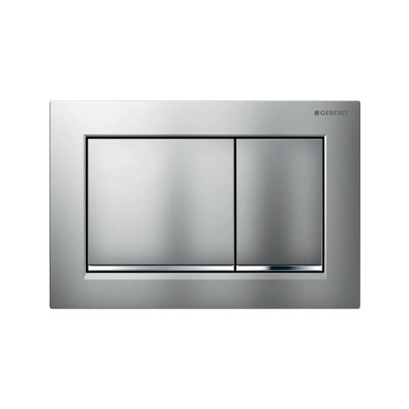 Vandens nuleidimo mygtukas Geberit Omega30, matinio ir blizgaus chromo spalvos. Yra 2 mygtukai skirtingų tipų vandens nuleidimui.