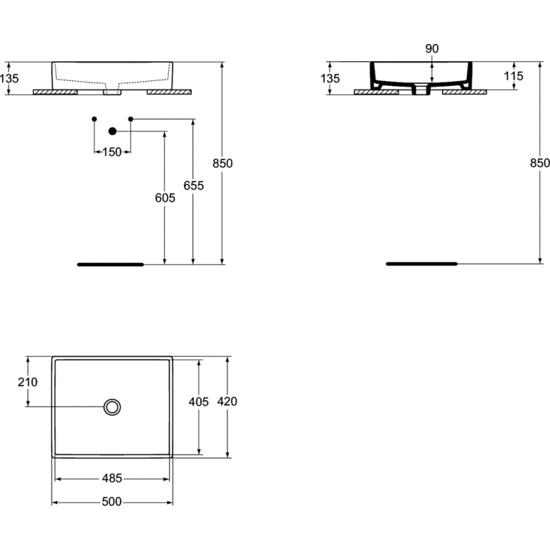 Praustuvas, Matmenys(PxAxG) - 500x135x420 mm, Baltos spalvos, Iš keramikos, Be skylės maišytuvui, Be persipylimo, Su montavimo komplektu (Ideal Standard E009567)