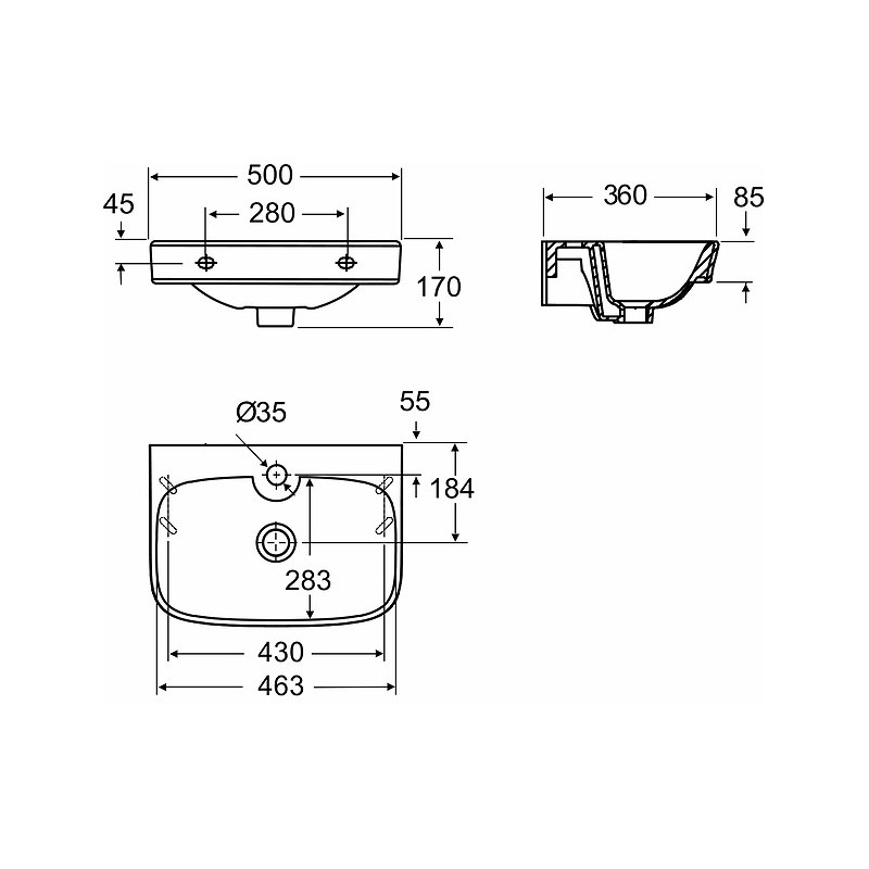 Praustuvas, Matmenys - 500x170x360 mm, Baltos spalvos, Keramikinis, Kvadratinis, Lengvai valomas, Tvirtinamas ant laikiklių, Su persipylimu, Su skyle maišytuvui viduryje, 5 metų garantija