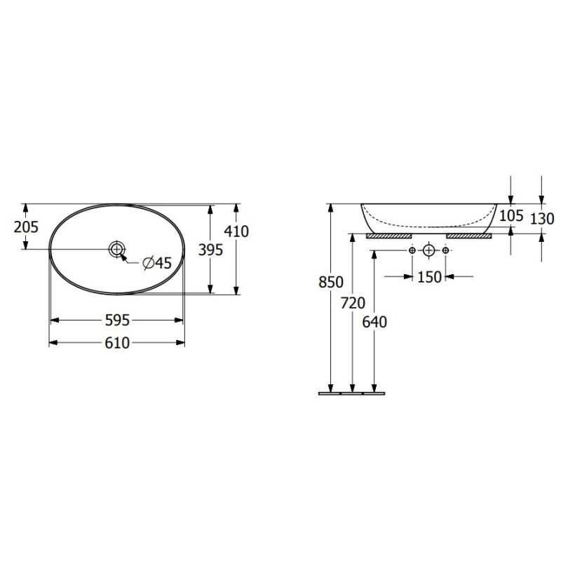 Praustuvas, Ovalus, Pastatomas, Matmenys - 610x130x410 mm, Baltos spalvos, Iš keramikos (TitanCeram), Lengvai valomas ir montuojamas, Be persipylimo, Be skylės maišytuvui, Šiuolaikinis dizainas, 2 metų garantija