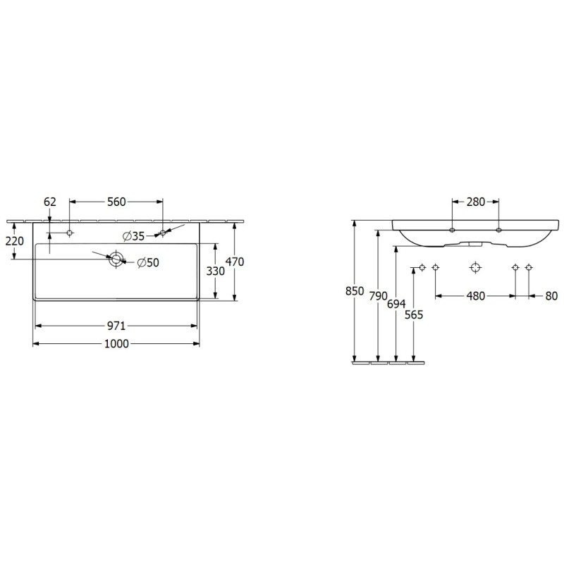 Praustuvas, Dvigubas, Pakabinamas, Matmenys 1000x470 mm, Baltos spalvos, CeramicPlus danga, Iš sanitarinės keramikos, Lengvai valomas ir montuojamas, Su persipylimu, Su 2 skylėmis maišytuvui, Šiuolaikinis dizainas, 2 metų garantija