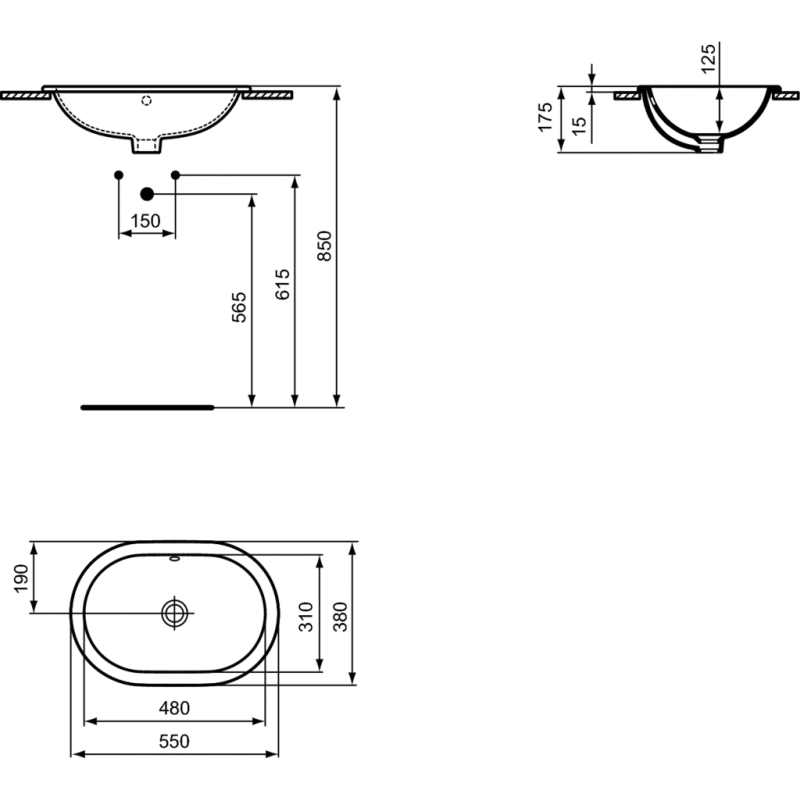Praustuvas, Matmenys 550x380x175mm, Baltos spalvos, Iš keramikos, Montuojamas iš apačios, Ovalus, Su persipylimu, Be skylės maišytuvui, IdealPlus paviršiaus danga