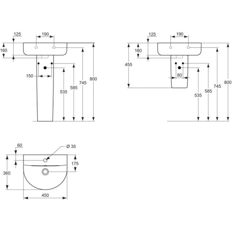 Praustuvas, Įvairių matmenų, Baltos spalvos, Iš keramikos, Su persipylimu, Su skyle maišytuvui, IdealPlus paviršiaus danga, Montuojamas ant pagrindo