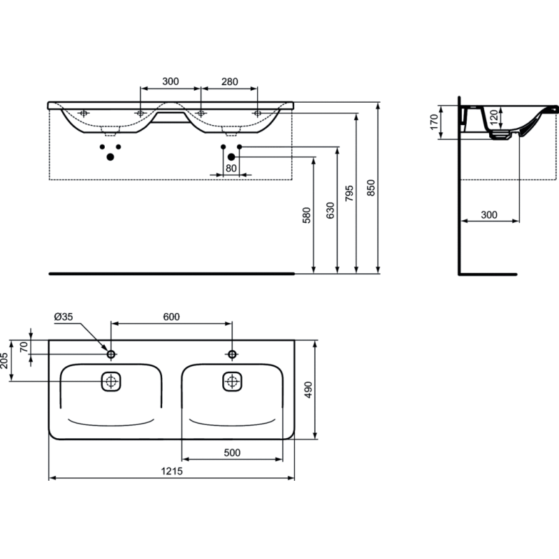 Praustuvas, Dvigubas, Matmenys 1215x490x170mm, Baltos spalvos, Iš keramikos, Baldinis, Su skyle maišytuvui