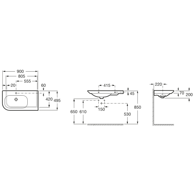 Praustuvas, Tvirtinamas prie sienos, Matmenys 900x495x200mm, Baltos spalvos, Iš keramikos, Lengvai valomas, Su persipylimu, Su skyle maišytuvui viduryje, Su integruota lentynėle dešinėje, Elegantiškas dizainas, 5 metų garantija