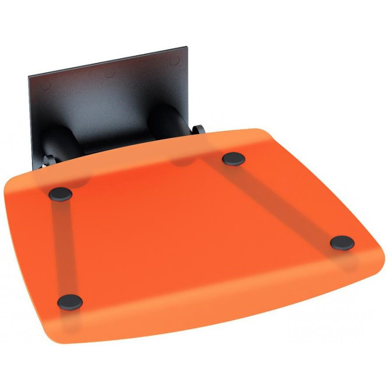 Dušo sėdynė, Atlenkiama, Trapecijos formos, Juodos spalvos konstrukcija, Skaidri oranžinė sėdynė, Keliamoji galia - 150 kg, Rekomenduojami dušo erdvės matmenys - 900x900 mm, Matmenys(PxAxG) - 390x130x360 mm, 10 metų garantija