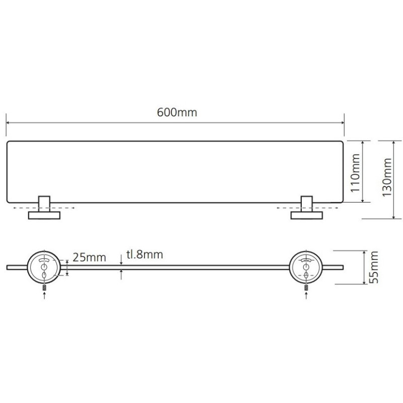 Lentynėlė, Stiklinė, Matmenys(PxAxG) 600x55x130mm, Žalvariniai chromuoti laikikliai, 2 metų garantija