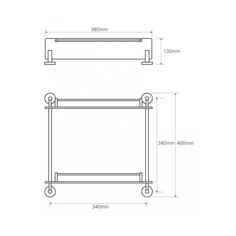 Dviguba lentynėlė Bemeta Omega 400mm, stiklinė, su borteliu. Matmenys - 400x400x120mm. Lentynėlė puikiai tiks susidėti įvairiems vonios reikmenims bei derinsis prie vonios kambario. Lentynėlės laikikliai pagaminti iš žalvario, chromuoti. Suteikiama 2 metų garantija.