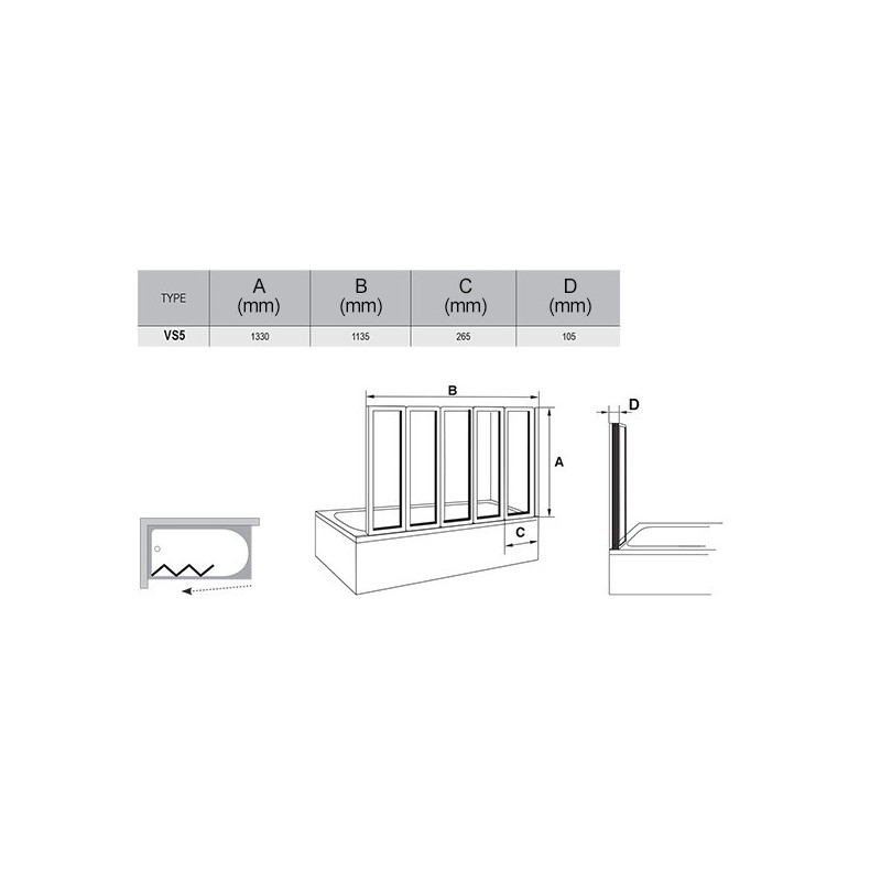 Sulankstoma vonios sienelė Ravak VS5, penkių dalių, su baltos spalvos profiliu ir plastiko Rain užpildu. Vonios sienelę Ravak VS5 sudaro penkios judamos dalys, kurios visiškai susilanksto į vonios vidų. Šis gaminys kelių varžtų pagalba pritvirtinamas prie sienos, todėl jį primontuoti yra itin paprasta. Vonios sienelė Ravak VS5 įrengiama ant stačiakampių vonių (Classic, Vanda II) arba klasikinių stačiakampių vonių su lygiu priekiniu kraštu.