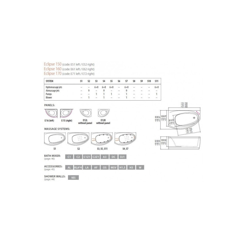 Akrilinė asimetrinė vonia Balteco Eclipse 150x95 cm, su apdaila E16. Vonia yra be masažo sistemos (S1 variantas). Balteco Panel+ šoninių uždangų sprendimo privalumai: L formos akrilinės uždangos yra be kampinių jungčių, jų kraštai dailiai užlenkti (nėra technologinių pjūvio pėdsakų), o taip pat naudojamos bevaržtės magnetinės jungtys, todėl uždangos yra visiškai vientisos. Tai, voniai Balteco Eclipse 150x95 cm, suteikia išskirtini dizainą, todėl ji derinsis prie įvairaus vonios kambario interjero. Yra galimybė komplektuoti Balteco Eclipse vonias su tonuoto grūdinto stiklo dušo sienele (perkama atskirai). Suteikiama 5 metų garantija
