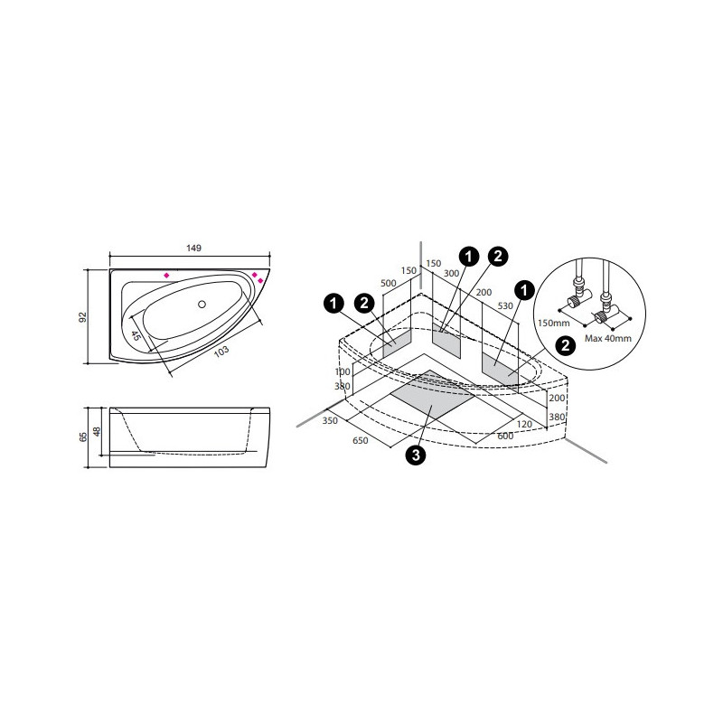 Akrilinė vonia, Asimetrinė, Matmenys(PxAxG) - 149x65x91 cm, Be masažo sistemos, Maks. vandens tūris - 177 l, Išskirtinis dizainas, Galimybė komplektuoti su tonuoto grūdinto stiklo dušo sienele, Bevaržtės magnetinės jungtys uždangoms