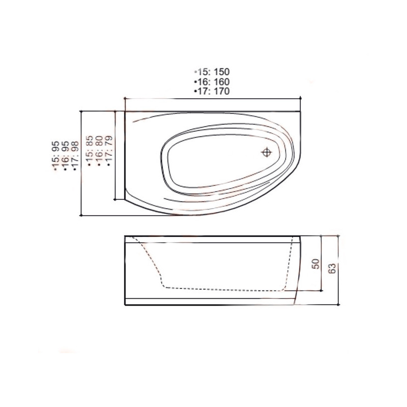 | Vonios forma | Asimetrinė |