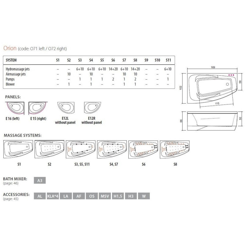 Akrilinė asimetrinė vonia Balteco Orion 169x102 cm, su apdaila E16 (kairė). Vonia yra be masažo sistemos (S1 variantas). Balteco Panel+ šoninių uždangų sprendimo privalumai: L formos akrilinės uždangos yra be kampinių jungčių, jų kraštai dailiai užlenkti (nėra technologinių pjūvio pėdsakų), o taip pat naudojamos bevaržtės magnetinės jungtys, todėl uždangos yra visiškai vientisos. Tai, voniai Balteco Orion 169x102 cm, suteikia išskirtini dizainą, todėl ji derinsis prie įvairaus vonios kambario interjero. Suteikiama 5 metų garantija