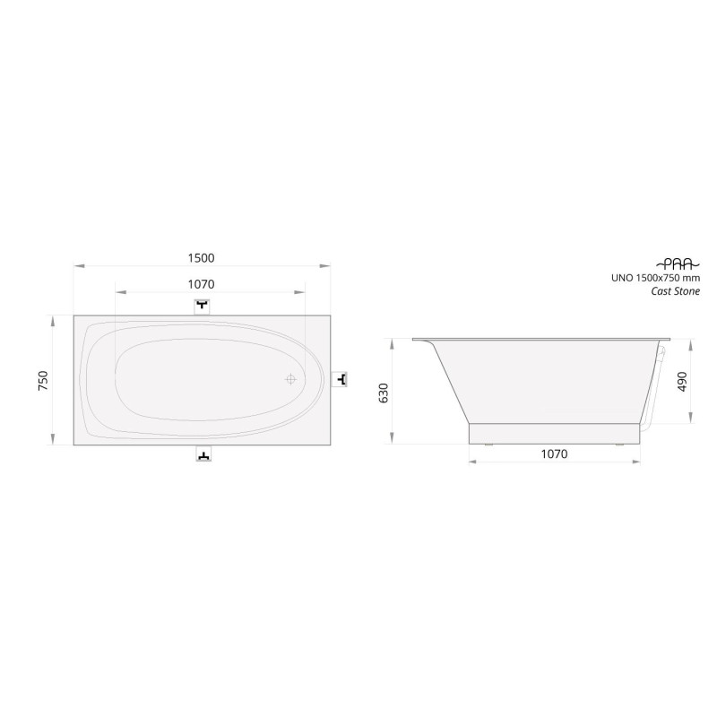 Akmens masės vonia Paa Uno 150x75 cm, su mažu paneliu, stačiakampė. Vonia Paa Uno derinsis prie įvairaus vonios kambario interjero. Vonios paviršius yra blizgus ir lengvai valomas, todėl galėsite mėgautis švaria vonia, neskirdami daug dėmesio jos priežiūrai. Akmens masės vonia Paa Uno yra iš tvirtos akmens masės, ilgai išlaiko šiltą vandenį bei yra atspari cheminėms priemonėms, todėl galite būti tikri, jog vonia tarnaus itin ilgai. Maksimalus vandens tūris - 210 l. Suteikiama 10 metų garantija.