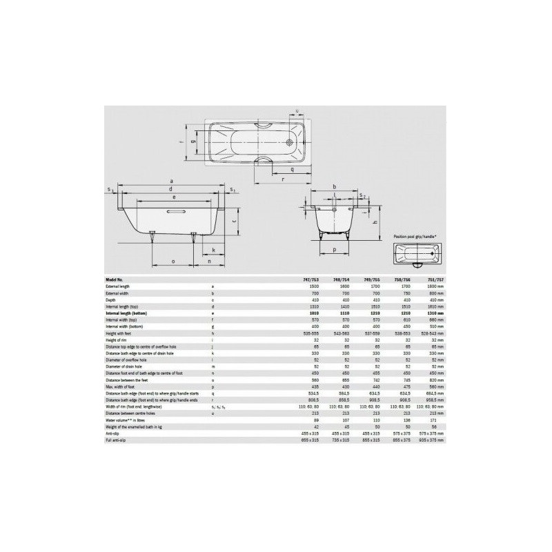 Emaliuoto plieno vonia, Stačiakampė, Su "Perlo efektu", Su skylėmis rankenėlėms, Matmenys 170x75x41 cm, Baltos spalvos, Maks. vandens tūris - 135 l, Atspari įbrėžimams, Itin lengvai valoma, Atspari karščiui, rūgštims ir kitokiems cheminiams poveikiams