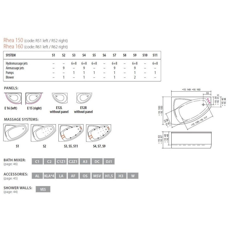 Akrilinė asimetrinė vonia Balteco Rhea 160x100 cm, su apdaila E15 (dešinė). Vonia yra su masažo sistema (Combi S4). Balteco Panel+ šoninių uždangų sprendimo privalumai: L formos akrilinės uždangos yra be kampinių jungčių, jų kraštai dailiai užlenkti (nėra technologinių pjūvio pėdsakų), o taip pat naudojamos bevaržtės magnetinės jungtys, todėl uždangos yra visiškai vientisos. Tai, voniai Balteco Rhea 160x100 cm, suteikia išskirtini dizainą, todėl ji derinsis prie įvairaus vonios kambario interjero. Yra galimybė komplektuoti Balteco Rhea vonias su tonuoto grūdinto stiklo dušo sienele (perkama atskirai).
