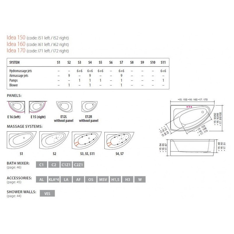 Akrilinė asimetrinė vonia Balteco Idea 160x95 cm, su apdaila E15. Vonia yra su masažo sistema (Slimline Hydro S11 variantas). Balteco Panel+ šoninių uždangų sprendimo privalumai: L formos akrilinės uždangos yra be kampinių jungčių, jų kraštai dailiai užlenkti (nėra technologinių pjūvio pėdsakų), o taip pat naudojamos bevaržtės magnetinės jungtys, todėl uždangos yra visiškai vientisos. Tai, voniai Balteco Idea 160x95 cm, suteikia išskirtini dizainą, todėl ji derinsis prie įvairaus vonios kambario interjero. Yra galimybė komplektuoti Balteco Idea vonias su tonuoto grūdinto stiklo dušo sienele (perkama atskirai).