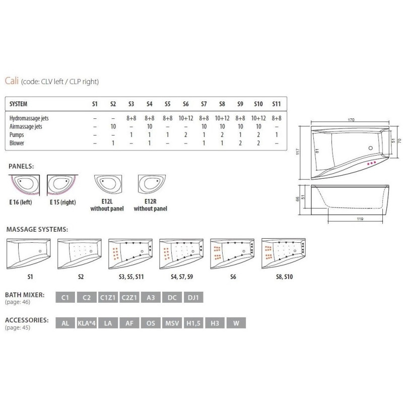 Akrilinė asimetrinė vonia Balteco Cali 170x117 cm, su apdaila E15 (dešinė). Vonia yra su masažo sistema (Combi S4). Balteco Panel+ šoninių uždangų sprendimo privalumai: L formos akrilinės uždangos yra be kampinių jungčių, jų kraštai dailiai užlenkti (nėra technologinių pjūvio pėdsakų), o taip pat naudojamos bevaržtės magnetinės jungtys, todėl uždangos yra visiškai vientisos. Tai, voniai Balteco Cali 170x117 cm, suteikia išskirtini dizainą, todėl ji derinsis prie įvairaus vonios kambario interjero.