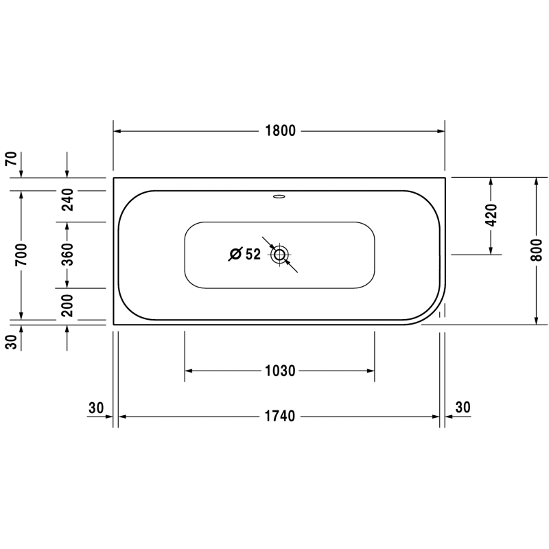 Vonia Duravit Happy D.2 180x80 cm, su panele ir kojomis, kairė