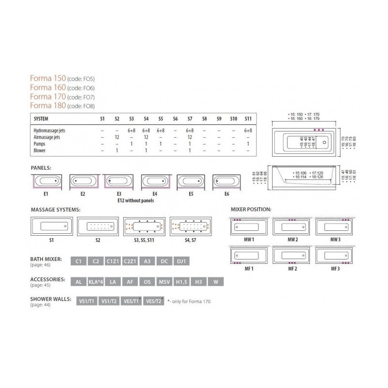 Akrilinė stačiakampė vonia Balteco Forma 180x80 cm, su apdaila E3, vonios maišytuvu ir komfortiška pagalvėle. Vonia yra su masažo sistema (Combi Lux S7). Balteco Panel+ šoninių uždangų sprendimo privalumai: L formos akrilinės uždangos yra be kampinių jungčių, jų kraštai dailiai užlenkti (nėra technologinių pjūvio pėdsakų), o taip pat naudojamos bevaržtės magnetinės jungtys, todėl uždangos yra visiškai vientisos. Tai, voniai Balteco Forma 180x80 cm, suteikia išskirtini dizainą, todėl ji derinsis prie įvairaus vonios kambario interjero. Taip pat vonia Balteco Forma yra su persipylimo sistema.