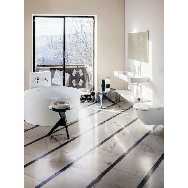 Apvali vonia iš kompozitinės medžiagos Sentec Laufen Val, 130x130x50.5 cm, laisvai statoma, su kojelėmis. Baltos spalvos vonia Laufen Val derinsis prie įvairaus vonios kambario interjero. Vonios paviršius yra blizgus ir lengvai valomas, todėl galėsite mėgautis švaria vonia, neskirdami daug dėmesio jos priežiūrai. Vonia Laufen Val ilgai išlaiko šiltą vandenį bei yra atspari cheminėms medžiagoms, todėl galite būti tikri, jog vonia tarnaus itin ilgai. Maksimalus vandens tūris - 460 l. Suteikiama 2 metų garantija.