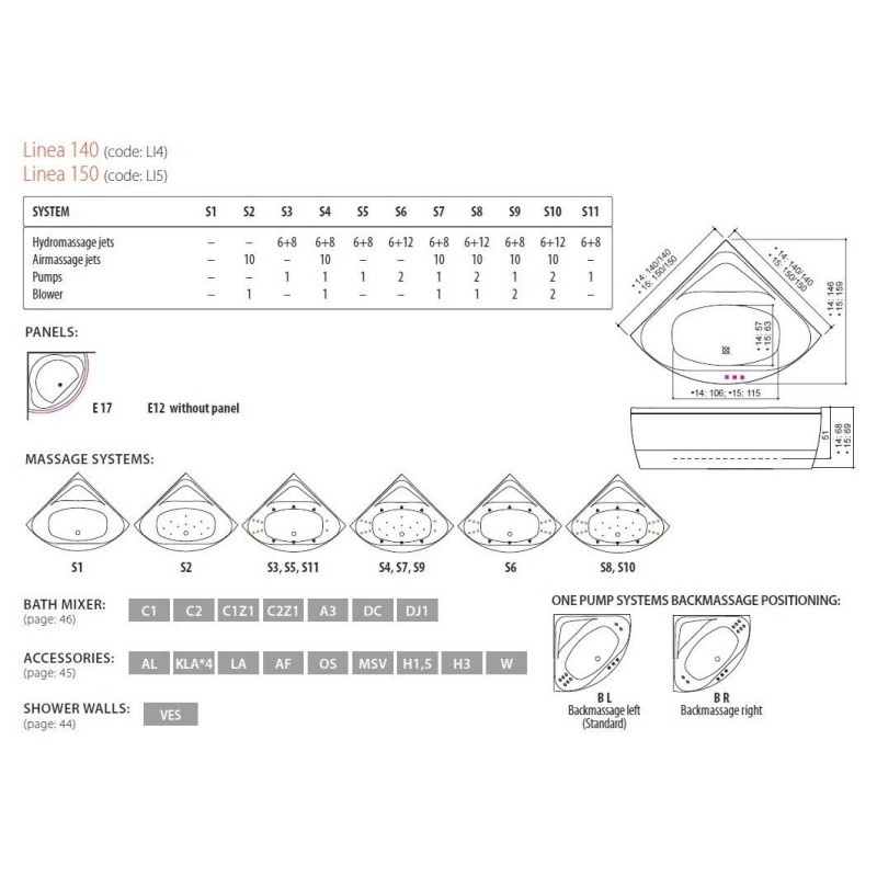 Akrilinė kampinė vonia Balteco Linea 150x150cm, su apdaila E17 ir masažo sistema Slimline Hydro S11. Balteco Panel+ šoninių uždangų sprendimo privalumai: L formos akrilinės uždangos yra be kampinių jungčių, jų kraštai dailiai užlenkti (nėra technologinių pjūvio pėdsakų), o taip pat naudojamos bevaržtės magnetinės jungtys, todėl uždangos yra visiškai vientisos. Tai, voniai Balteco Linea 150x150cm, suteikia išskirtini dizainą, todėl ji derinsis prie įvairaus vonios kambario interjero.