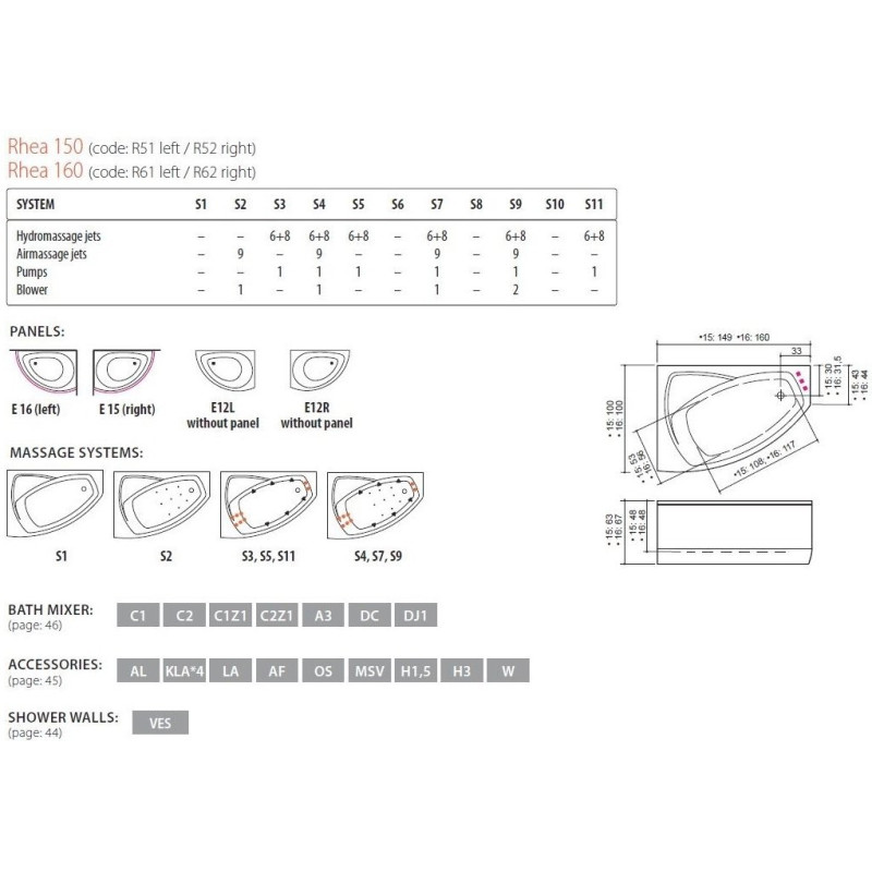 Akrilinė asimetrinė vonia Balteco Rhea 149x100cm, su apdaila E15/E16. Vonia yra be masažo sistemos (S1 variantas). Balteco Panel+ šoninių uždangų sprendimo privalumai: L formos akrilinės uždangos yra be kampinių jungčių, jų kraštai dailiai užlenkti (nėra technologinių pjūvio pėdsakų), o taip pat naudojamos bevaržtės magnetinės jungtys, todėl uždangos yra visiškai vientisos. Tai, voniai Balteco Rhea 149x100cm, suteikia išskirtini dizainą, todėl ji derinsis prie įvairaus vonios kambario interjero. Yra galimybė komplektuoti Balteco Rhea vonias su tonuoto grūdinto stiklo dušo sienele (perkama atskirai). Suteikiama 5 metų garantija