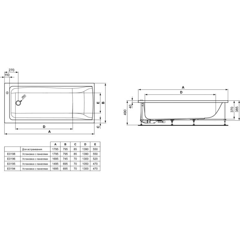 Akrilinė vonia, Stačiakampė, Matmenys 180x80x49cm, Baltos spalvos, Maks. vandens tūris - 232l, Laisvai statoma, Su atrama ir sifonu, 25 metų garantija