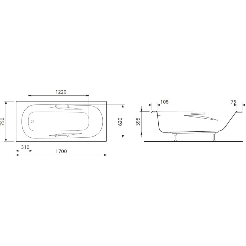 Plieninė vonia, Stačiakampė, Matmenys 170x75x39.5cm, Su rankenėlėmis, Baltos spalvos, Maks. vandens tūris - 180l, Atspari temperatūrų skirtumams, Itin lengvai valomas paviršius, 5 metų garantija