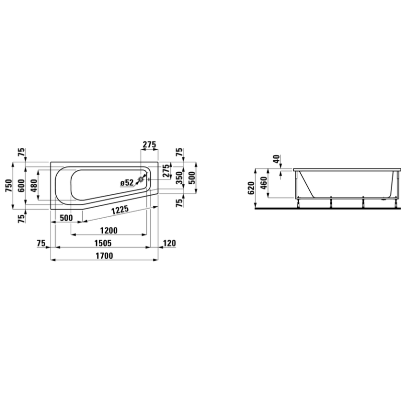 Vonia Laufen Solutions 170x75cm, asimetrinė, įleidžiama