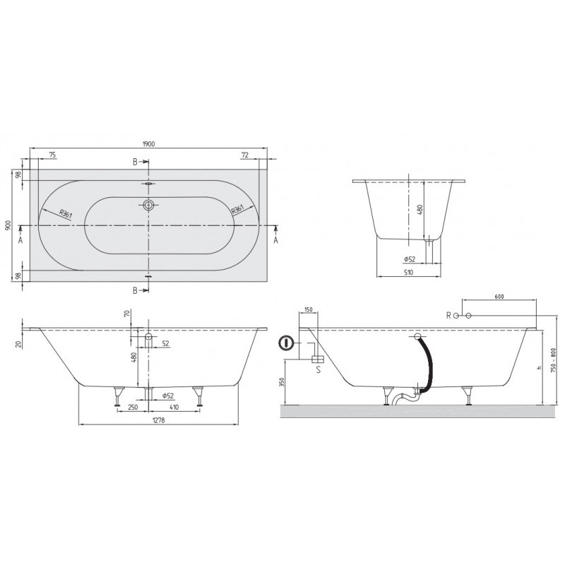 Akrilinė vonia, Stačiakampė, Matmenys 190x90cm, Baltos spalvos, Maks. vandens tūris - 218l, 10 metų garantija, Lengvai valomas, atsparus cheminėms priemonėms, blizgus paviršius, Ilgiau išsilaikantis šiltas vanduo